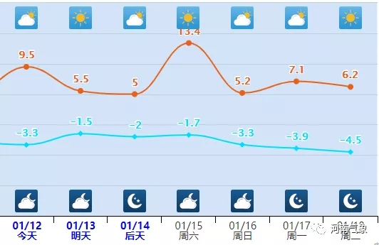 今天下午到夜里,多云间晴天,西北风4到5级,阵风7到8级。最高温度:8到9度;最低温度:零下4度到零下3度。