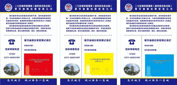 近期,河医周边多家餐饮单位都陆续收到了二七区餐饮服务业油烟净化器清洗“三色”记录卡,这是二七区城市综合执法局为治理餐饮油烟难题而推行的油烟管理公示牌和“三色”分类管理登记卡。今后,执法人员在日常检查中很直观的就能了解到餐饮单位油烟净化设施的清洗维护频率,进店食客也能清楚明白地看出商户是否按照要求安装使用油烟净化设施。