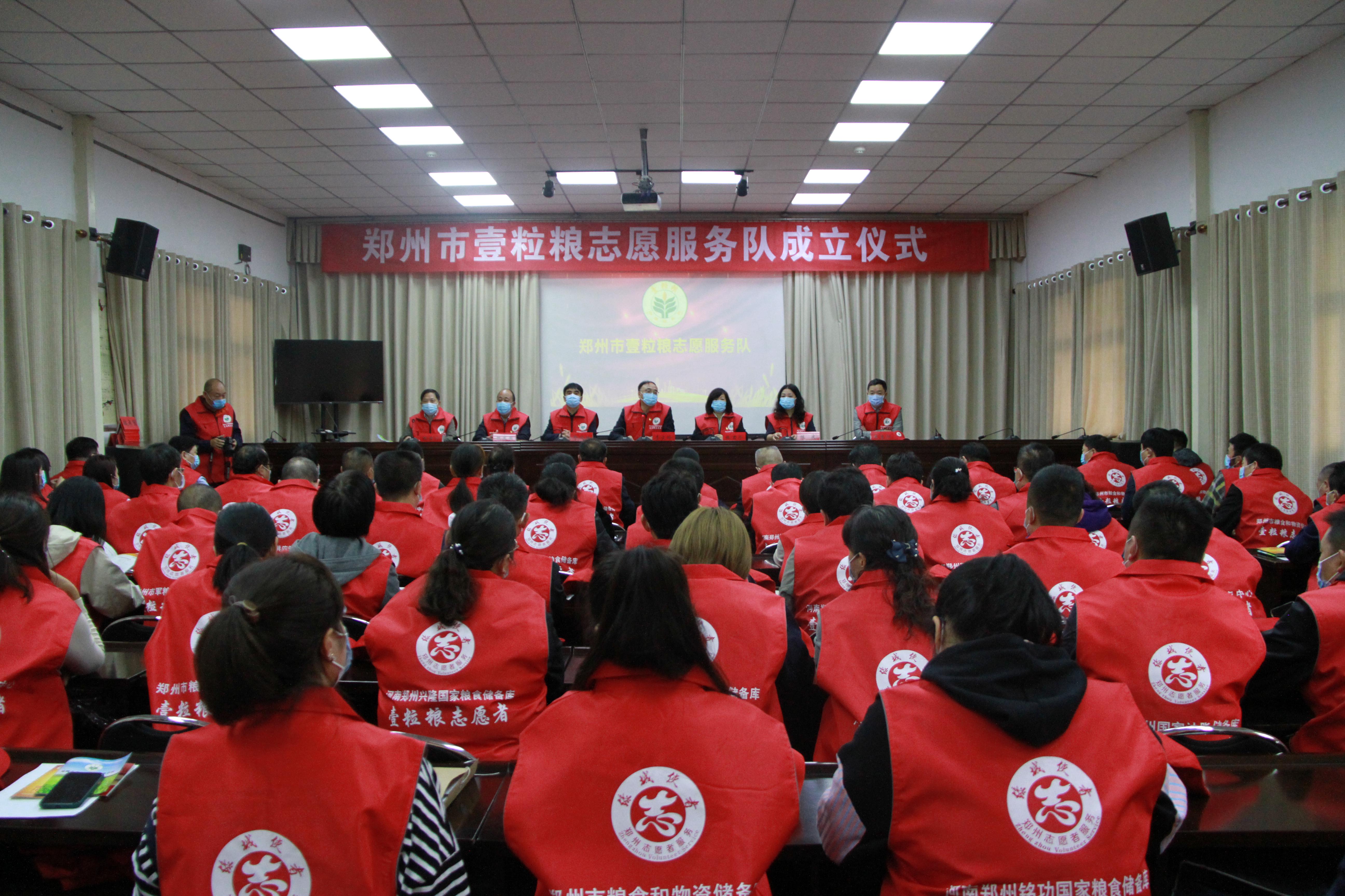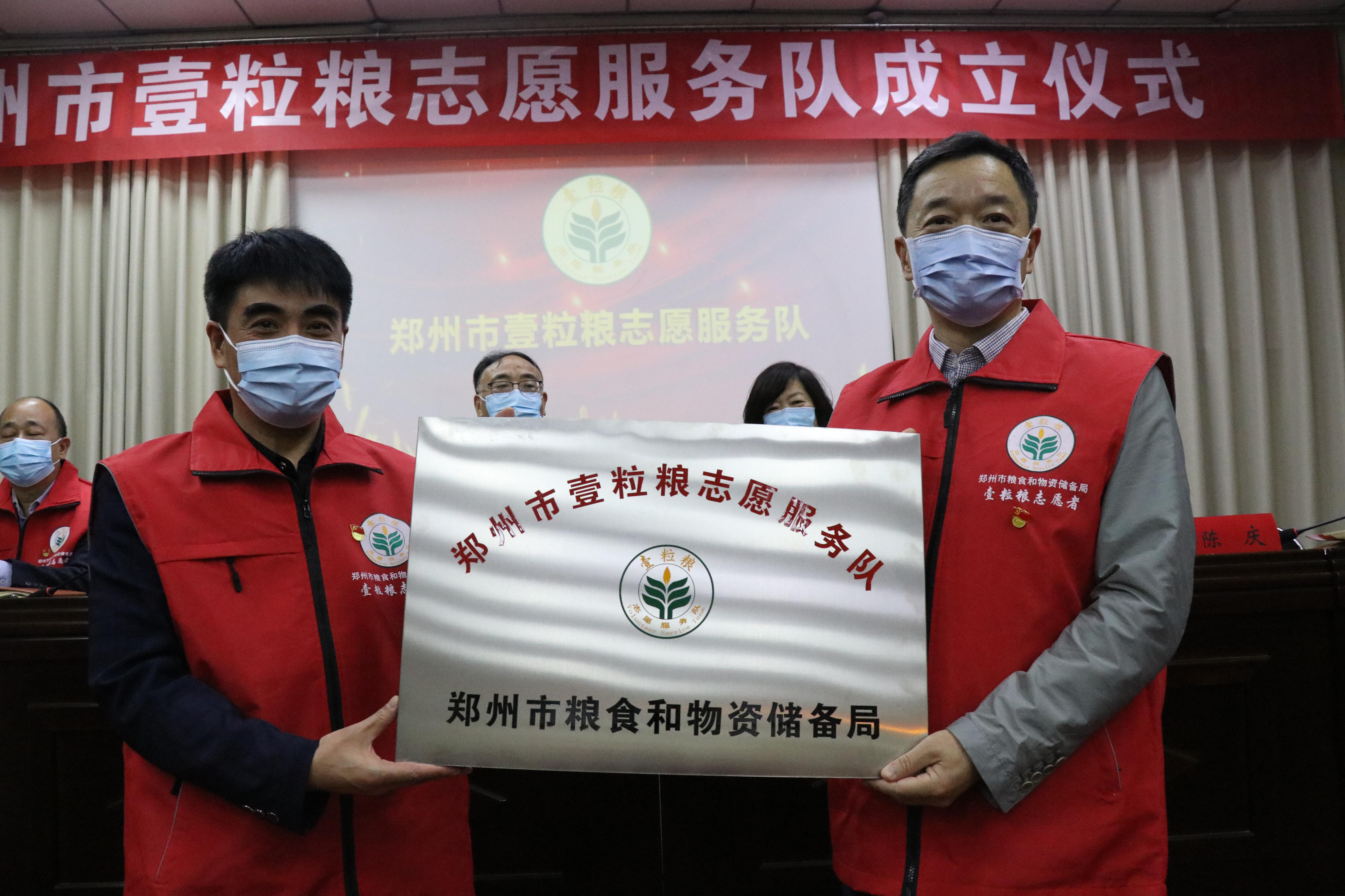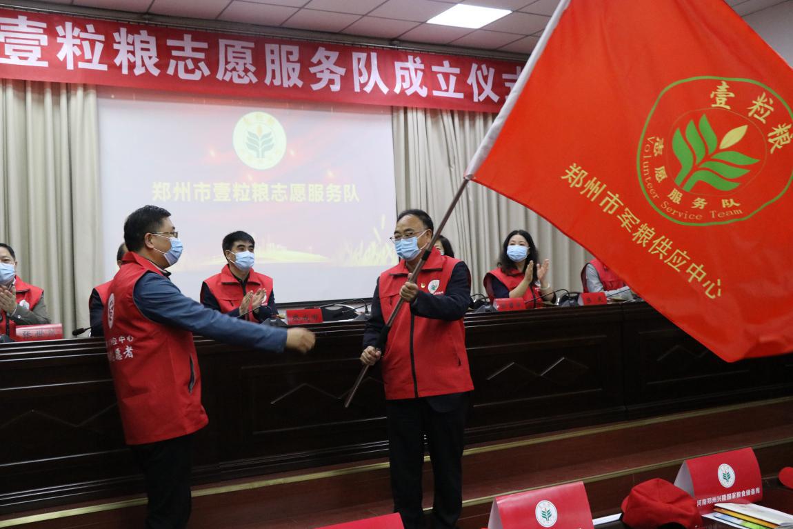 成立仪式在“壹粒粮”志愿服务宣传片《粮食安全“五进一请”》和雄壮的《国歌》中拉开序幕。市直文明办主任陈庆宣读了市直机关文明办《关于成立“郑州市壹粒粮志愿服务队”的批复》,市直机关工委副书记乔成田向市粮食和物资储备局颁授“郑州市壹粒粮志愿服务队”牌匾,局党组书记、局长李文岭为局机关和局系统9支壹粒粮志愿服务队授旗。郑州兴隆国家粮食储备库壹粒粮志愿服务队队长王伟代表壹粒粮志愿者发言,号召全市壹粒粮志愿者行动起来,发挥行业特色,倡树爱粮节粮新风,助力文明创建。