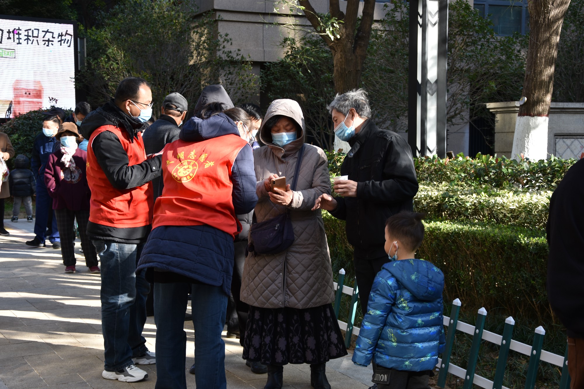 在检测现场,郑州市民政工业管理服务中心的志愿者们协助维持队伍秩序,帮助中老年人等有困难的群众使用手机扫码注册,开辟老年人绿色通道,做到有问必答、有难必帮,引导老年人尽快做好核酸检测。