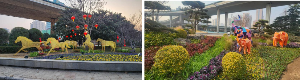 在空间塑造上,中心充分挖掘桥下、立交等灰色空间潜力,巧妙融入“骏栖花茵”“松韵共生”“松岳象和”等主题意象,同时巧妙运用46块景石及11组动物主题艺术小品(含马、大象等造型),强化场地趣味性与互动感,赋予公共空间以情感温度与文化记忆,极大增强了公共空间的趣味性与亲和力。