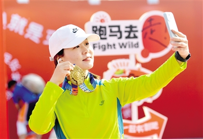 完赛者将奖牌与姓氏徽章“合二为一”拍照留念