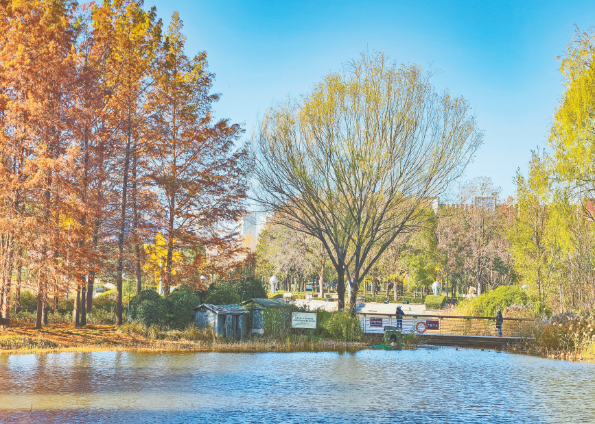 ▲郑州植物园内,湖边斑斓的树木倒映在水中,景色迷人。