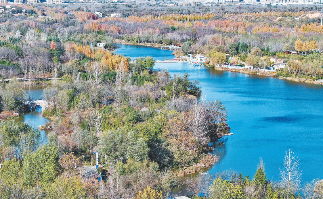▲初冬的郑州索河郊野公园,索河蜿蜒穿境,湖泊如镜,五彩的树林与随风摇摆的芦苇,共同组成一幅美丽画卷。快来这里奔赴一场“森系”约会吧。