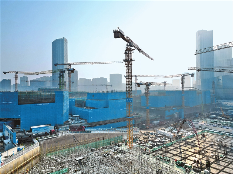 1月27日,与华润郑东万象城一路之隔,郑州市郑东新区又一“顶流”商业街区——弘坊项目工地上,1400多名工人正在紧张忙碌,17台塔吊同时作业,混凝土车、切割机等轰鸣作响。