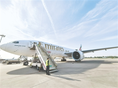 (记者 张倩 文/图)4月7日上午,阿联酋航空的一架B777全货机满载着跨境电商货物从郑州机场飞往迪拜,郑州机场首条直通迪拜的定期国际货运航线成功开通,这也是中东地区规模最大的航空公司——阿联酋航空首次在郑运营货运航线。